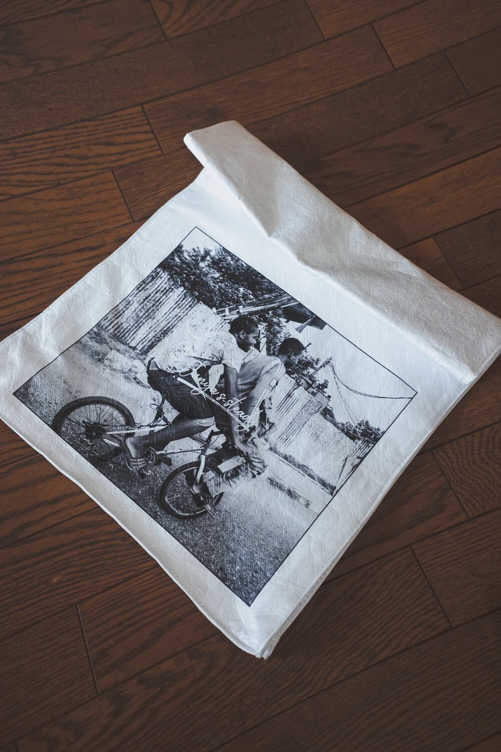 SHOPなどで使われる茶色の袋などを思わせるフォルムのタイベック素材のバッグです。